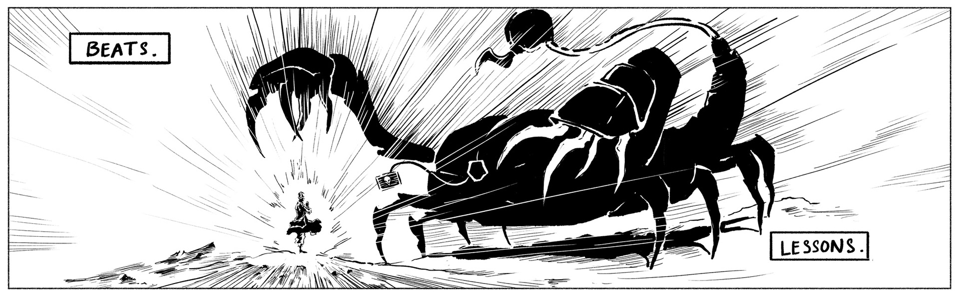 BEATS: LESSONS | One that didn’t make it out to final, unfortunately, but we had a great time coming up with a few style frames and character sheets for this Beats project that never materialised. How can we say no to drawing a giant robotic scorpion monster battling a shape-shifting monk in cyberspace?!